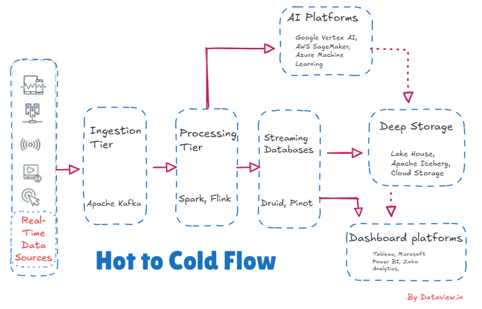 In application, such transition is determined by time, usage, and processing stages. Hot data is first treated in streaming systems (such as Flink or Spark Streaming) and may be enriched or aggregated. After it serves its original purpose, it is compressed, abbreviated, or archived and sent to cost-effective storage – like data lakes, object storage, or warehouses. That cold data is then put to historic analysis, reporting, compliance, or model training, not real-time actions.